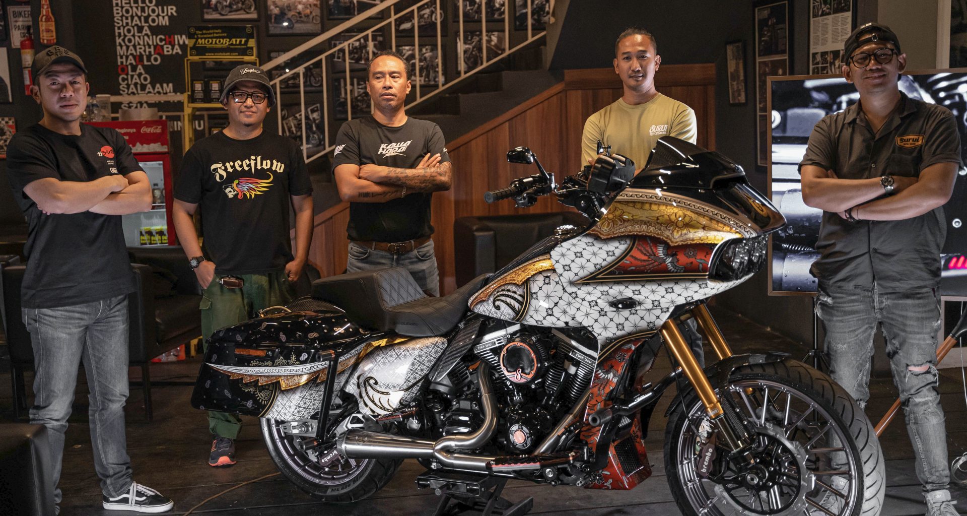 Nah, untuk finishingnya karena memang tujuannya untuk memperkenalkan budaya Indonesia ada di H-D Road Glide ini lewat ornament batik. Untuk paint job dikerjakan oleh salah satu maestro custom painting di Indonesia Mochamad Syamsul Fahmi yang akbrab di sapa Fahmi Free Flow dari Bandung.